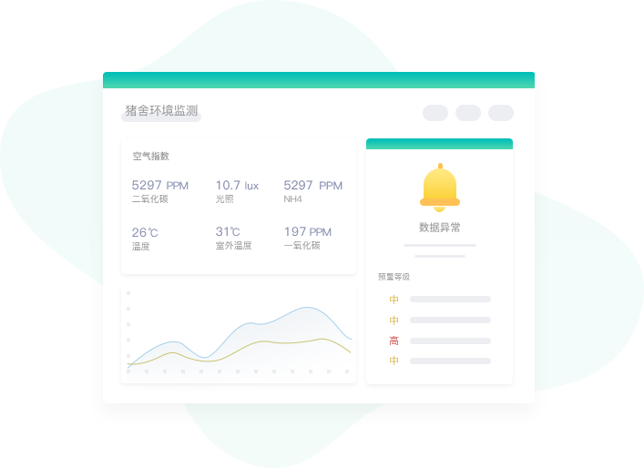 集成高精度環境傳感器,24小時不間斷監測養殖場內的溫濕度、氨氣濃度、二氧化碳、濃度、光照強度等關鍵指標。環境參數指標異常時,預警系統即時響應,發送短信、APP消息通知,提示用戶及時處理;啟動智能控制系統,自動調節至最適宜動物生長的環境條件。